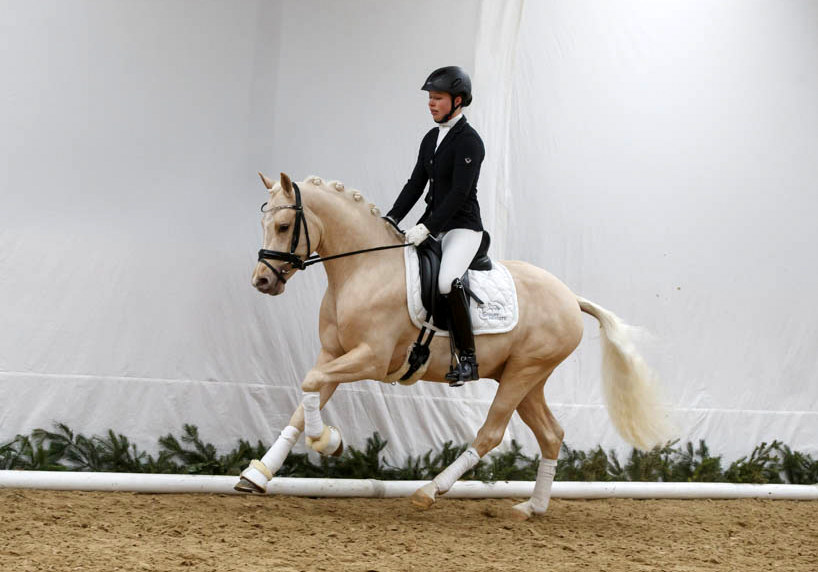 Daim AT, Prämienhengst der Körung im Zuchtgebiet Weser Ems 2018. Der Sohn des Bundeschampions D-Day AT in der begehrten Palominofarbe mit einem Stockmass von 141 cm ist ein kleinerer Vertreter seiner Rasse der aber mit großem Bewegungspotential ausgestattet ist. Großer Trabablauf aus einer sehr gut funktionierenden Hinterhand ließ Daim AT bei seiner Körung in das Prämienlot tanzen. Sein bergauf gesprungener Galopp war sehr schön anzusehen und der Schritt war in allen Situationen unerschütterlich. Mit sehr viel Übersicht und Ruhe wurde auch das Freispringen überzeugend absolviert.