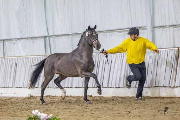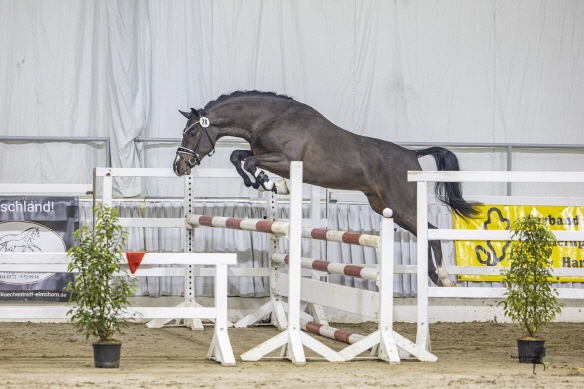 Dancing in the Midnight AT, ein Sohn des hannoverschen Siegerhengstes 2021 Dancing in the Moonlight AT, präsentiert sich als ein wahrer Traum in dunkler Jacke. Mit enormem Schwung im Trab, einem sehr gut bergauf gesprungenen Galopp sowie einem hervorragenden, raumgreifenden Schritt überzeugt er auf ganzer Linie. Doch nicht nur seine Grundgangarten und sein Interieur sind von außergewöhnlicher Qualität – auch am Sprung überzeugt er mit exzellentem Vermögen und viel Übersicht.